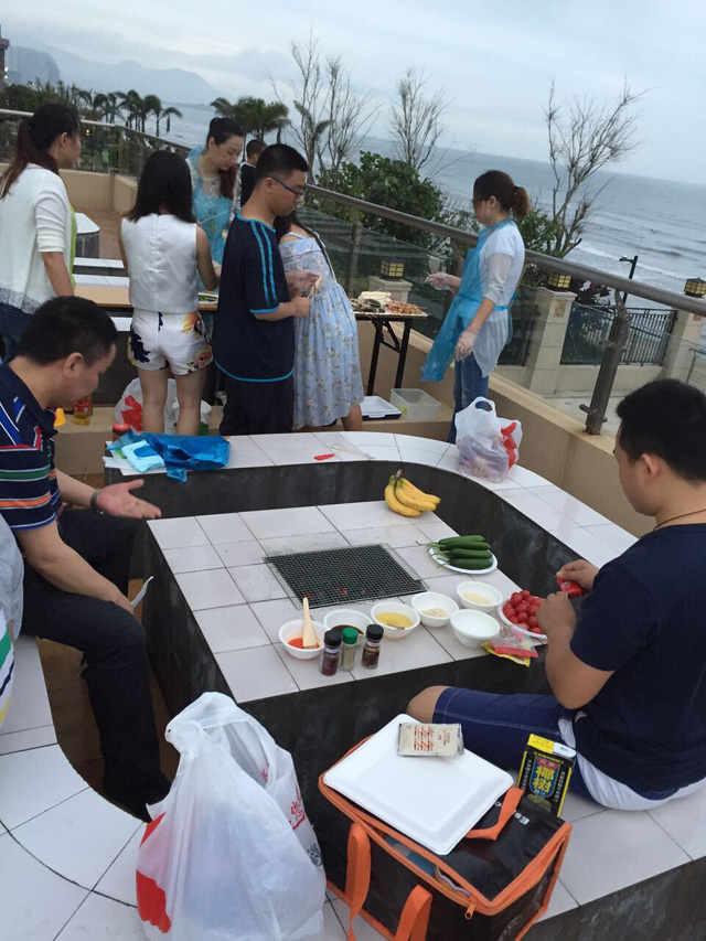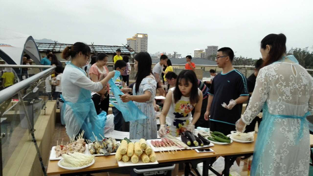 下午,虹海灣BBQ開始,大家密切配合,洗菜、燒火、把食物一個個竄好,炭火燃起,各路廚藝好手便開始大展拳腳,有條不紊地將每一串食材都烤至完美,嘗過的無不拍手稱贊,各種聲音匯合成一支美妙動聽的“野炊交響曲”,好一派熱鬧景象。