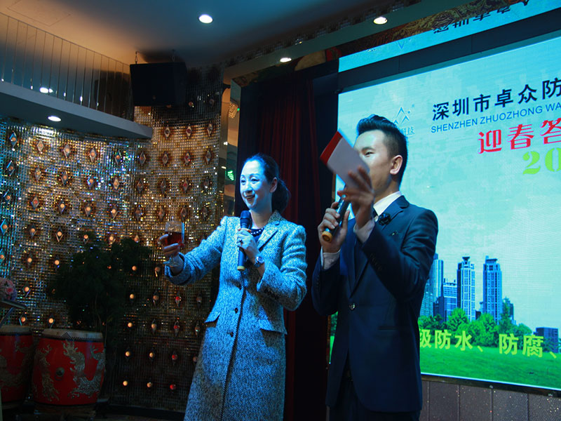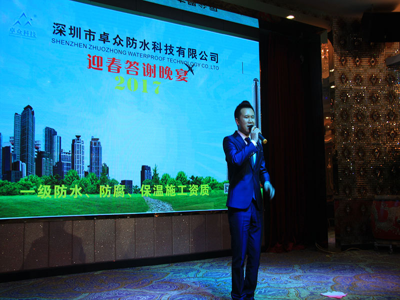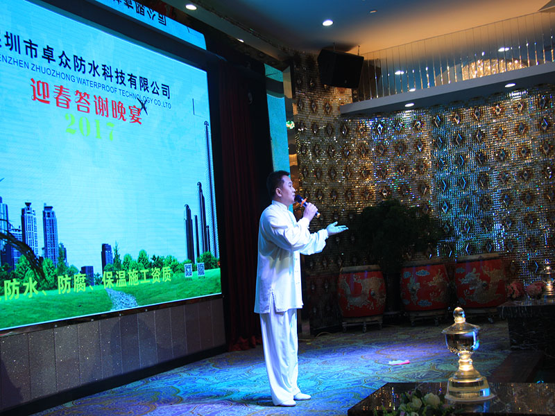 下午6:30,晚宴開始,卓眾防水總經理陳建平上臺致歡迎詞,首先陳總對所有領導嘉賓的到來致以最熱烈的歡迎和最誠摯的感謝,陳建平總經理講了以下三點: